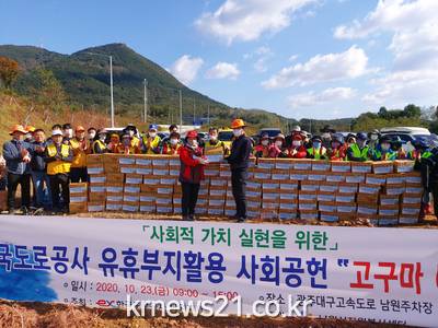 남원시자원봉사센터는 10월 23일(금) 한국도로공사 남원지사(지사장 신규성)와 함께 올 한해 정성껏 키운 고구마를 수확하고 지역사회의 어려운 이웃들에게 전달하는 행사를 진행하였다.