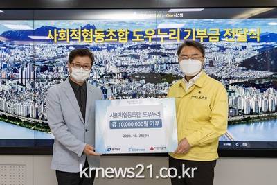 광진구(구청장 김선갑)가 28일 사회적협동조합 도우누리로부터 이웃돕기 성금 1천만 원을 기부 받았다.