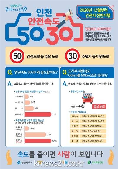인천광역시(시장 박남춘)는 ‘안전속도 5030’ 전면 시행을 위해 올 연말까지 교통안전시설 정비를 완료하고 시민 홍보를 강화 한다고 밝혔다.