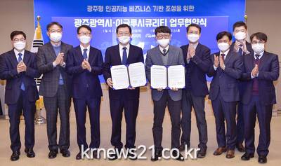 광주광역시는 10일 오전 시청 비즈니스룸에서 인공지능 유치기업인 ㈜이글루시큐리티와 광주형 인공지능 비즈니스 기반 조성을 위한 51번째 업무협약을 체결하고 법인설립 및 지역사무소 설립을 통해 광주 인공지능 사이버 보안 산업 육성에 적극 협력키로 했다.