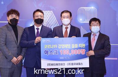 ㈜비티에프테크는 광주시민과 자원봉사자들의 코로나19 감염예방을 위해 마스크 10만장을 (사)광주광역시자원봉사센터에 전달했다.