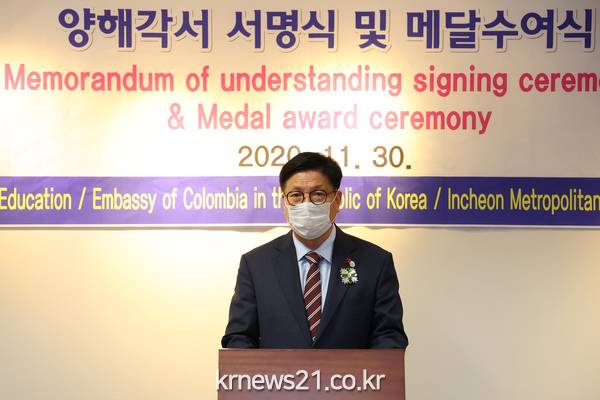 도성훈 인천광역시교육감이 주한콜롬비아대사관에서 콜롬비아 정부가 수여하는 ‘산 카를로스 훈장’을 수훈했다. 30일 훈장 수여식에서 ‘후한 카를로스 카이자 로세로’ 주한콜롬비아 대사는 “콜롬비아의 국권신장과 국제관계에 뚜렷한 공헌을 세운 도성훈 인천광역시교육감의 업무성과와 헌신에 감사드린다”며 인사를 전했다. ‘산 카를로스’ 훈장은 콜롬비아 정부가 국제관계 분야에 뚜렷한 공헌을 세운 외국인에게 수여하는 것으로 도성훈 교육감은 콜롬비아 정보통신기술교육발전에 기여한 공로를 인정받았다. 인천시교육청은 2009년부터 현재까지 콜롬비아와 교육정보화 교류를 지속해오고 있으며 약 200명의 콜롬비아 교원이 인천에 초청되어 정보화 연수를 받았다. 연수 후에는 이들 중 상당수가 고국에서 ICT 활용교육을 이끄는 핵심리더 교사로서 콜롬비아 정보교육 발전에 큰 기여를 하고 있다. 훈장 법령 조문에서는 콜롬비아 내 약 200여 개의 교육기관 및 12,000여 명의 학생이 수혜를 받았으며 콜롬비아 학교 곳곳에 ICT 도입 및 활용 역량이 증진되었다고 밝혔다. 올해는 코로나19로 인해 어려운 상황 속에서도 양 국가 교사들이 온라인 연수와 공동 프로젝트를 통해 국경을 초월하여 가르침에 대한 열정을 나누고 있다. 도성훈 교육감은 “한국전 당시 중남미에서 유일한 파병국가였던 콜롬비아와는 70년이 지난 오늘, 유래 없는 감염병 유행 상황에서 다시 한번 상호 연대와 협력의 필요성을 느낀다”며 “코로나 이후 시대를 대비한 미래교육의 기틀을 함께 만들기 위해 양국이 더욱 활발한 교류로 우정과 신뢰를 쌓을 수 있도록 최선의 노력을 다하겠다”고 말했다. 인천시교육청은 2021년에는 자체 예산과 기술을 투자하여 콜롬비아 보고타에 비대면 교육을 위한 스마트교실 구축을, 2022년부터는 교육부와 협력하여 약 5년간 첨단교실 구축사업을 진행한다고 밝혔다. 한편 콜림비아대사관에서는 2021년 2월 3~5일 콜롬비아 대통령 방한 시 도성훈 인천광역시교육감을 특별게스트로 초대해 양국의 교육 분야 협력방안에 대해 함께 논의 할 것을 제안하기도 했다.