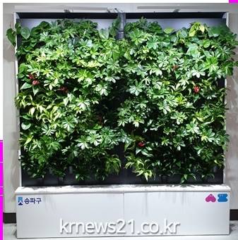 송파구(구청장 박성수)는 주민들의 건강을 위협하는 미세먼지 등 유해물질을 제거하고 쾌적한 실내 환경을 조성하기 위해 송파구청 및 송파어린이문화회관에 ‘친환경 수직정원’ 15개를 설치했다고 16일 밝혔다.