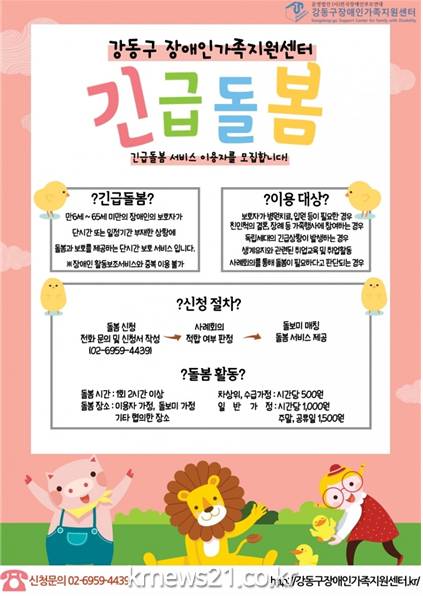이정훈 강동구청장은 “최근 장애인 가정의 양육 부담으로 당사자와 그 가족들이 극단적인 선택까지 하는 일이 지속적으로 일어나고 있다. 강동구장애인가족지원센터의 긴급돌봄서비스는 관내 장애인 가정의 돌봄 부담을 완화하는데 꼭 필요한 역할을 하게 될 것으로 기대한다.”고 말했다.