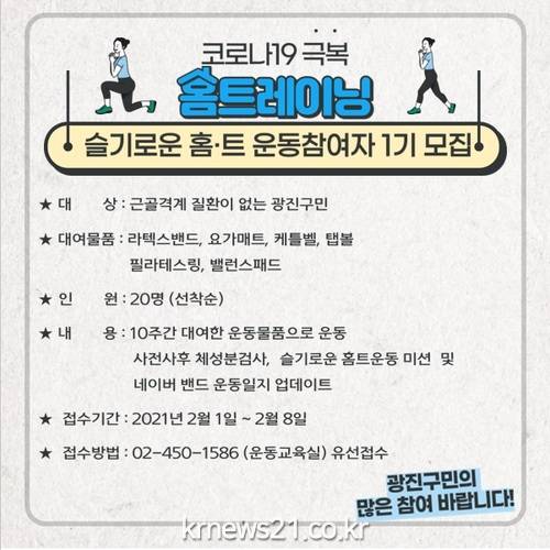 광진구(구청장 김선갑)가 코로나19 장기화로 감소된 구민들의 신체 활동 향상을 위해 ‘코로나19 극복! 슬기로운 홈트’ 운동 프로그램을 운영한다.