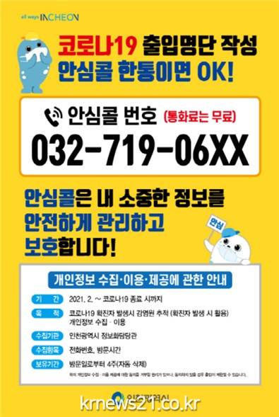 안심콜 출입관리서비스는 수기명부 작성으로 인한 개인정보 유출이 사회적 문제로 부각되고 있고, QR코드 사용에 어려움을 느끼는 디지털 취약계층을 위해 기존 출입관리 방식을 개선한 서비스다. 통화료는 발신자(시민)와 수신자(인천시) 모두 무료다.