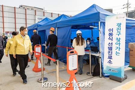 광진구(구청장 김선갑)가 공사현장 내 집단감염을 방지하기 위해 8일 자양1구역 재건축 현장 근로자를 대상으로 찾아가는 이동식 선별진료소를 운영했다.