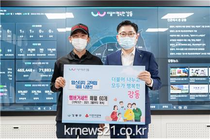 강동구(구청장 이정훈)는 지난 5월 26일(수), 맘스터치 고덕점(대표 나영선)과 햄버거세트 기부 약정식을 가졌다.