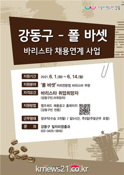 강동구(구청장 이정훈)가 지역주민의 일자리 창출을 위해 6월 1일부터 14일까지 구인기업인 ㈜엠즈씨드와 함께 '채용연계사업’을 통해 폴 바셋 바리스타로 근무할 직원을 모집한다.