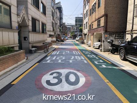 특히, 보도설치가 어려운 좁은 이면도로에 보행자우선도로를 설치하여 디자인도막포장으로 차량의 주의 운전 및 감속을 유도했으며, 보행자 안전을 위해 통학로에 스탬프디자인 포장을 했다.
