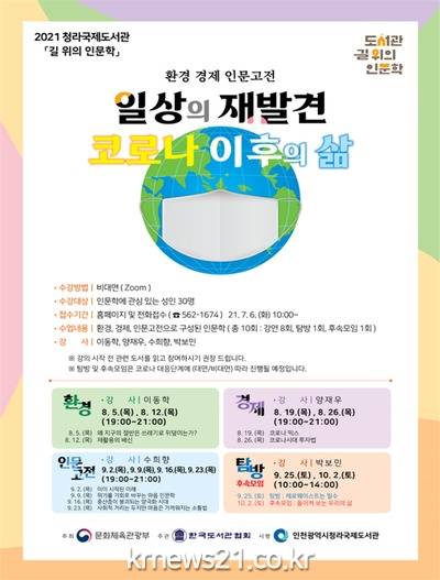 인천광역시(시장 박남춘)는 8월부터「2021 길 위의 인문학」,「도서관 지혜학교」,「어른들을 위한 동화」등 다양한 인문학 특강을 청라국제도서관에서 진행한다고 밝혔다.