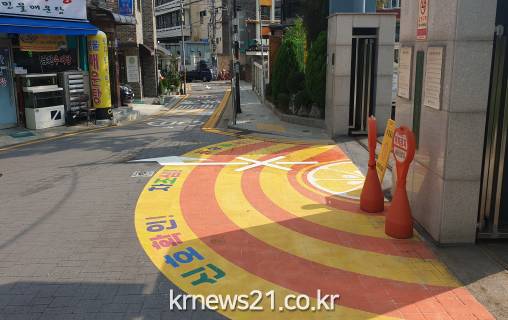 구는 이와 같은 안전 사각지대를 해소하기 위해 이면도로 내 학교 정문 앞에 노랑안전자리를 설치, 등하교 아동이 안전하게 대기할 수 있고 운전자가 먼 거리에서도 어린이 보호구역임을 인지할 수 있도록 구현했다.