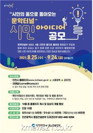 인천광역시(시장 박남춘)는 오는 9월 24일까지 문학터널 통행료 무료화에 따른 구조개선 방안에 대한 시민 아이디어를 공모한다고 밝혔다.