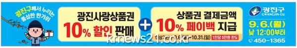 광진사랑상품권은 9월 6일 낮 12시부터 비플제로페이, 페이코 등 20개의 결제 앱을 통해 구매할 수 있다. 거주 지역과 관계없이 1인당 월 70만 원 한도 내에서 10% 할인된 가격으로 구입이 가능하다.