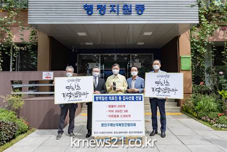 광진구(구청장 김선갑)가 13일 광진구재난극복민간협의회(이하 광재협)로부터 코로나19 방역 현장 근무자 격려품을 전달받았다.