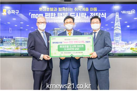 박성수 송파구청장은 “행복도시락 전달에 뜻을 모아준 롯데호텔 월드와 시그니엘 서울에 감사드린다.”면서 “앞으로도 지역사회와 힘을 모아 코로나19로 위기 속에 있는 아동들이 희망을 잃지 않도록 보다 다양한 지원 정책과 서비스 발굴에 힘쓰겠다.”고 전했다.