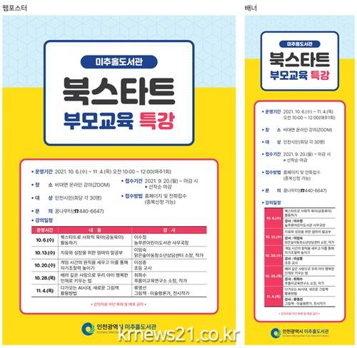 인천광역시(시장 박남춘)는 오는 10월 6일(수)부터 11월 4일(목)까지 5주간 매주 1회, 미추홀도서관 꿈나무터에서 북스타트 부모교육 특강을 진행한다고 밝혔다.
