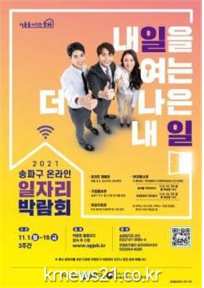 송파구(구청장 박성수)는 오는 11월 1일부터 19일까지 온라인 플랫폼을 활용하여 ‘2021 송파구 일자리 박람회’를 개최한다고 30일 밝혔다.