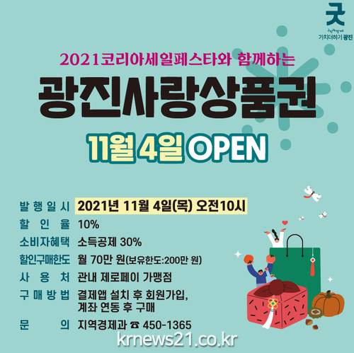 광진사랑상품권은 11월 4일 오전 10시부터 100억 원 규모로 발행되며, 비플제로페이, 페이코 등 22개의 결제 앱을 통해 구매할 수 있다.