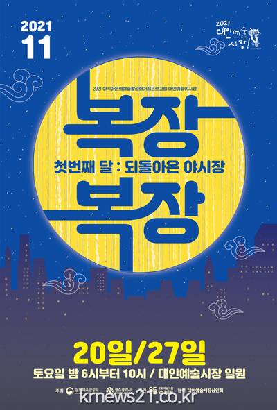 11월 야시장 ‘복장복장<되돌아올 복(復), 복 복(福)>’은 되돌아온 야시장과 함께 대인예술시장에 복(福)이 찾아와 예전의 활기 넘치는 시장의 모습을 되찾길 기원하며 다양한 문화예술프로그램을 운영해 코로나19로 복장 터졌던 시민들과 상인들의 마음을 달랠 계획이다.