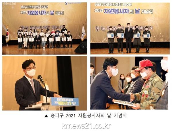 송파구(구청장 박성수)가 운영하는 자원봉사센터는 ‘자원봉사센터 설립 25주년’과 ‘자원봉사자의 날(12월 5일)’을 맞이해 지난 11월 30일 송파구민회관 대강당에서 「2021 자원봉사자의 날 기념식」행사를 개최했다고 밝혔다.