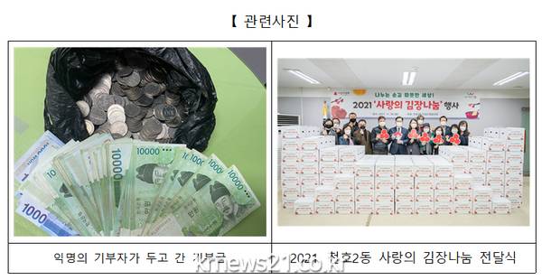 검정 비닐봉지 안에는 익명의 기부자가 자투리 돈으로 모은 것으로 추정되는 지폐다발과 동전 꾸러미가 총 100여만 원 들어있었다. 성함도 알려주지 않고 급히 동주민센터를 떠난 익명의 기부자는 주위를 훈훈하게 했다.