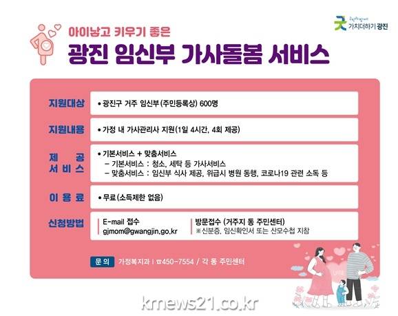 광진구(구청장 김선갑)가 임신부의 가사부담을 줄이고 일과 가정의 양립을 지원하기 위해 임신부 가정에 무료 가사돌봄 서비스를 제공한다.