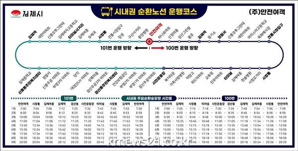 100번 시내버스는 07:00(첫차)~19:30(막차)까지 안전여객 차고지(교동)에서 출발하여 하나로마트→김제역→시장통→터미널→시민운동장→검산동→김제역→시장통→안전여객 차고지로 운행하며,