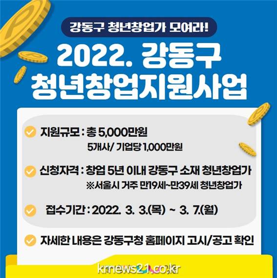강동구(구청장 이정훈)가 3월 3일(목)부터 3월 7일(월)까지 ‘2022년 청년창업지원사업’에 참여할 기업을 모집한다.