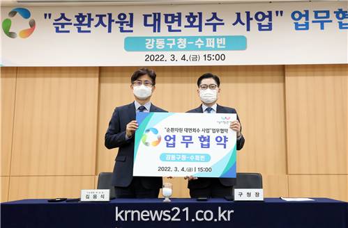 강동구(구청장 이정훈)는 지난 4일, 강동구청 5층 대강당에서 ㈜수퍼빈과 함께 순환자원 대면회수 사업 「수퍼 모아」 업무협약을 체결했다고 밝혔다.
