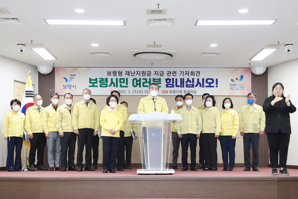 시는 23일 시청 중회의실에서 김동일 시장과 박금순 보령시의회 의장, 시의원 등 관계자가 참석한 가운데 기자회견을 갖고 ‘보령형 재난지원금’지원계획을 발표했다.
