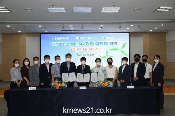 인천광역시(시장 유정복)는 29일 한국환경공단, NH농협은행 인천영업본부와 함께 ‘자원순환 및 ESG 경영 실천을 위한 폐현수막 새활용 시범사업 업무협약’을 체결했다고 밝혔다.