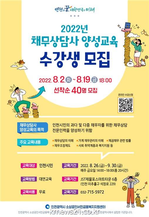 인천광역시(시장 유정복)는 코로나19 바이러스와 높은 인플레이션 등 경제적 고통을 호소하는 인천시민들의 채무문제를 전문적으로 상담할 수 있는 채무상담사 양성교육을 실시한다고 밝혔다.