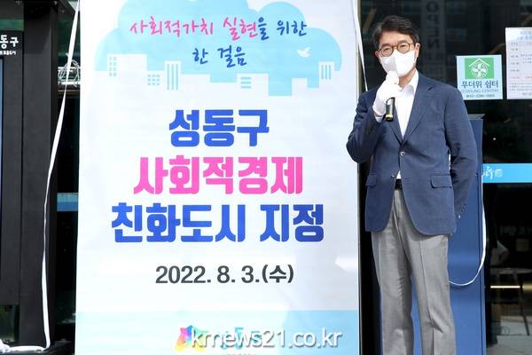 성동구(구청장 정원오)가 고용노동부 주관 ‘2022년 사회적경제 친화도시’에 선정되어 지난 3일 제막식을 진행하였다.