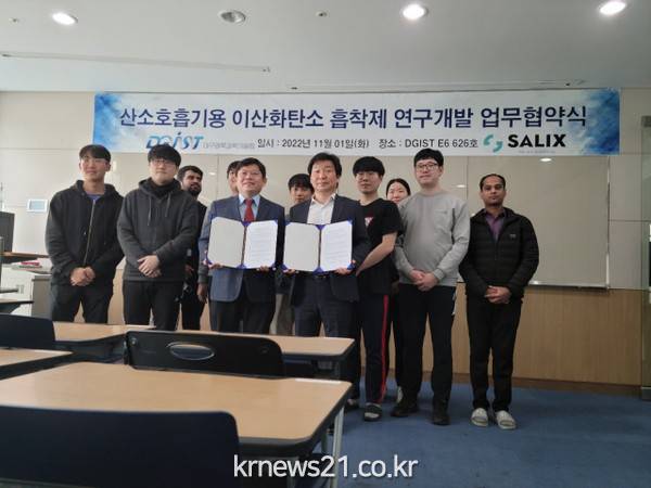 산소호흡 기술 전문기업 샐릭스가 1일 DGIST (총장: 국양) 에너지공학과 인수일 교수 연구팀과 산소호흡기용 이산화탄소 흡착제 개발을 위한 양해 각서를 체결했다고 밝혔다.