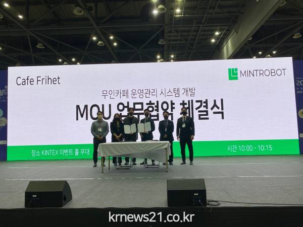 민트로봇(대표 강형석)은 무인 카페 운영 회사인 카페프리헷과 ‘무인 카페 운영 및 관리 시스템 개발에 대한 상호 협력에 대한 양해각서’를 2022년 10월 27일 로보월드 행사 기간 체결했다고 밝혔다.