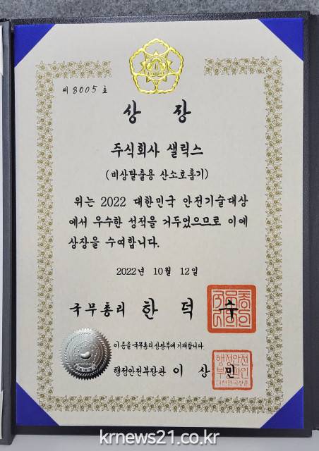 국무총리상을 받은 샐릭스의 ‘비상탈출용 산소호흡기’는 화재와 같은 비상 상황에서 탈출 시 사용하는 산소호흡기다. 이 기술은 내뱉는 숨을 모아 활용하는 기술을 적용해 일회 사용 시 30분 이상의 사용 시간을 확보할 수 있으며, 국민 심사에서 특히 높은 점수를 받았다.
