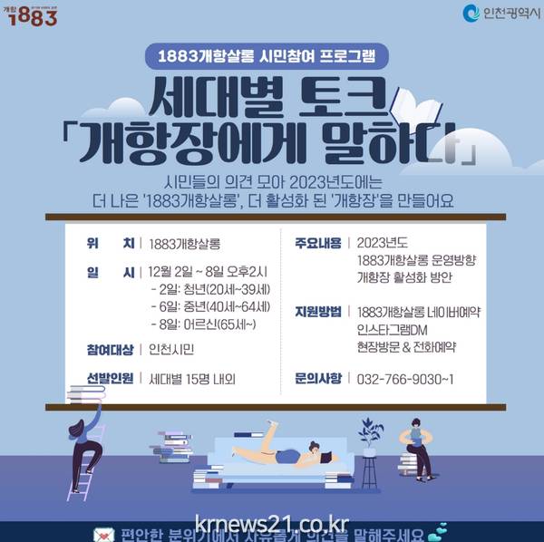 인천시민 각 세대의 의견을 반영해 내년도 1883개항살롱 운영방향 및 개항장 활성화 방안을 마련한다는 방침으로 금년도 추진성과도 함께 공유한다.