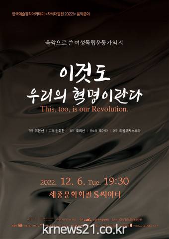 한국예술창작아카데미와 유은선이 주최, 바이윤슬이 주관한 유은선 작곡가의 작곡발표회 ‘이것도 우리의 혁명이란다’가 12월 6일(화) 오후 7시 30분 세종문화회관 S씨어터에서 안희찬 지휘자가 이끄는 리움챔버오케스트라의 연주로 개최된다. 이번 공연은 현대문화가 기획했다.