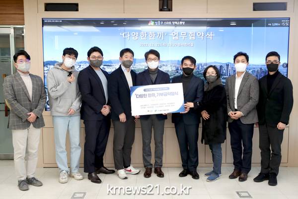 ▲ 사진=지난22일 성동구청에서‘다양한 한끼’업무협약식 단체사진을 찍고 있다. (가운데 정원오 성동구청장)