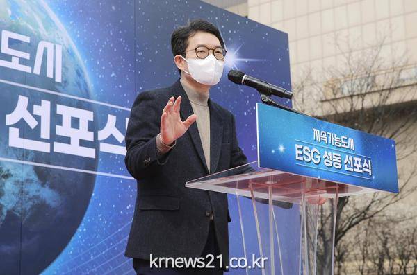 ▲ 사진=지난해 3월 말 지속가능도시 ESG성동 선포식에서 인사말을 하고 있는 정원오 성동구청장