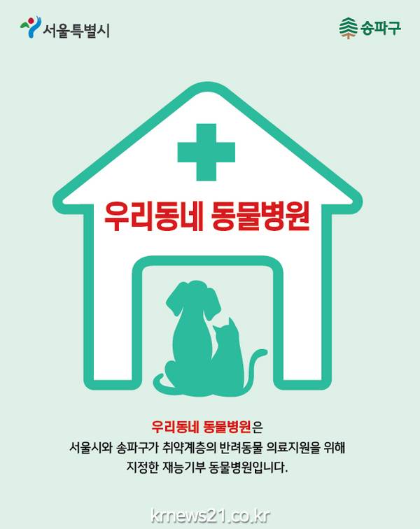 송파구(구청장 서강석)가 동물복지가 구현되는 ‘반려 공생도시’ 조성을 위해 올해부터 취약계층 반려인들의 경제적 부담을 덜어주는 ‘우리동네 동물병원’ 사업을 운영한다고 9일 밝혔다.