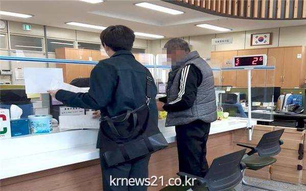 ▲ 사진=성동구청 공무원이 노숙생활을 하던 박 씨와 함께 동주민센터를 방문하여 전입신고를 하고 있다.