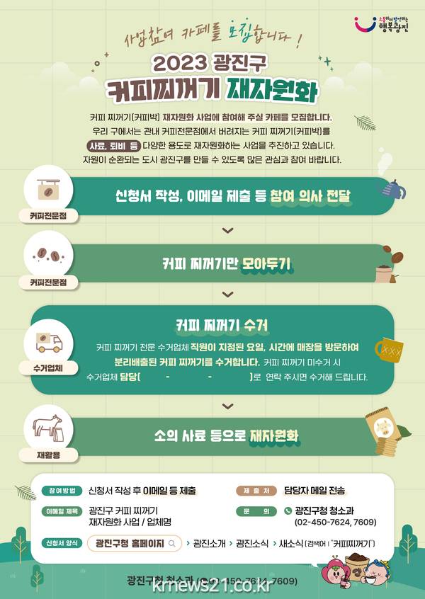 광진구(구청장 김경호)가 자원이 순환되는 도시를 조성하기 위해 커피찌꺼기(커피박) 재자원화 사업을 지속 추진한다.