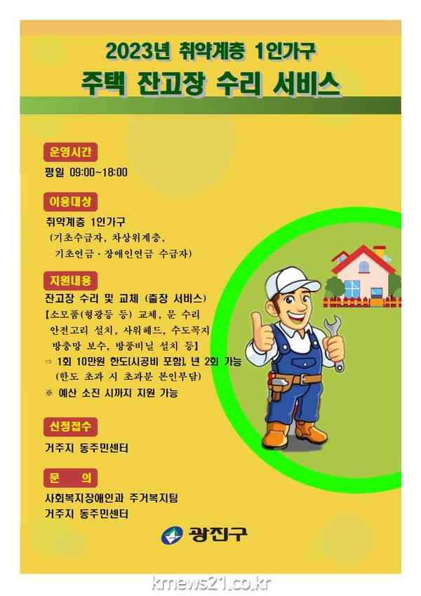 광진구(구청장 김경호)가 취약계층 1인 가구를 위해 주택 잔고장 수리 비용을 지원한다.