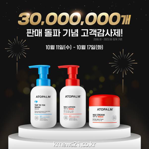 이번 누적 판매 수치는 아토팜의 대표 제품인 ‘MLE크림’과 ‘MLE로션’ 포함 2008년 10월부터 2023년 6월까지 합산된 판매량이다. 아토팜은 영유아 화장품 카테고리라는 점을 고려할 때 3000만개가 팔린 것은 업계에서 이례적인 일이라고 강조하며, 아토팜을 사랑해 주시는 고객들의 성원에 보답하는 마음으로 빅 이벤트를 기획했다고 밝혔다.
