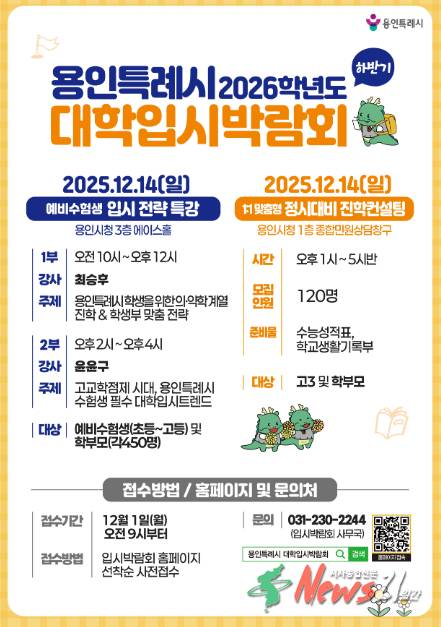 용인특례시(시장 이상일)는 12월 1일 오전 10시부터 오후 5시 30분까지 시청 에이스홀과 종합민원상담창구에서 ‘하반기 2026학년도 대학입시박람회’를 연다고 25일 밝혔다.