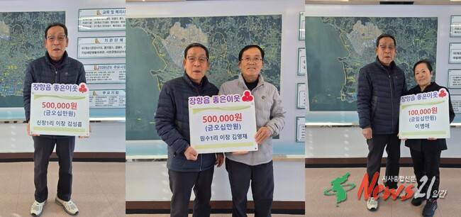 장항읍에 연초부터 따뜻한 나눔의 손길이 이어지며 지역사회에 온기를 전하고 있다.주민들의 자발적이고 지속적인 기부가 복지 사각지대 해소에 실질적인 힘이 되고 있다.이번 후원에는 김성흠 신창1리 이장이 50만원, 김영재 원수1리 이장이 50만원, 이병애 씨가 10만원을 기부해 총 110만원의 성금이 모였다.이번 기부는 일회성 후원이 아닌, 평소에도 장항읍을 위해 꾸준히 나눔을 실천해 온 기부자들의 참여로 이뤄져 더욱 의미를 더하고 있다.
