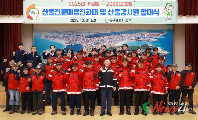 동구청제공[뉴스21일간=임정훈]울산 동구는 10월 31일 오늘 오전 10시 가을철 산불 조심 기간을 맞아 동구청 2층 대강당에서 산불 전문 예방 진화대 및 산불 감시원 발대식을 개최했다.     이날 발대식에는 김종훈 동구청장을 비롯해 관계 공무원, 산불 전문 예방 진화대 및 산불 감시원 등 40여 명이 참석해 산불 예방과 신속한 대응을 위한 결...
