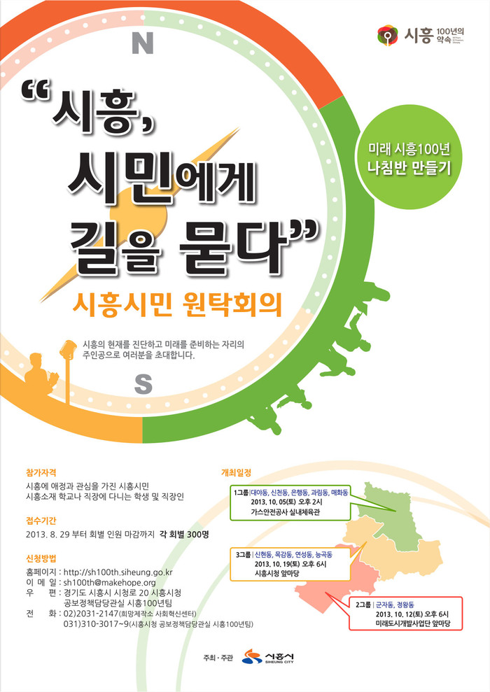 시흥시(시장 김윤식)는 오는 10월 5일 토요일 오후 2시 한국가스안전공사 실내체육관(대야동)을 시작으로 ▲10월 12일 토요일 오후6시 미래도시개발사업단 앞마당(정왕동) ▲10월 19일 토요일 오후6시 시흥시청 앞마당(장현동) 등 총 3차례의 ‘시흥시민 원탁회의「시흥, 시민에게 길을 묻다」’를 개최한다.